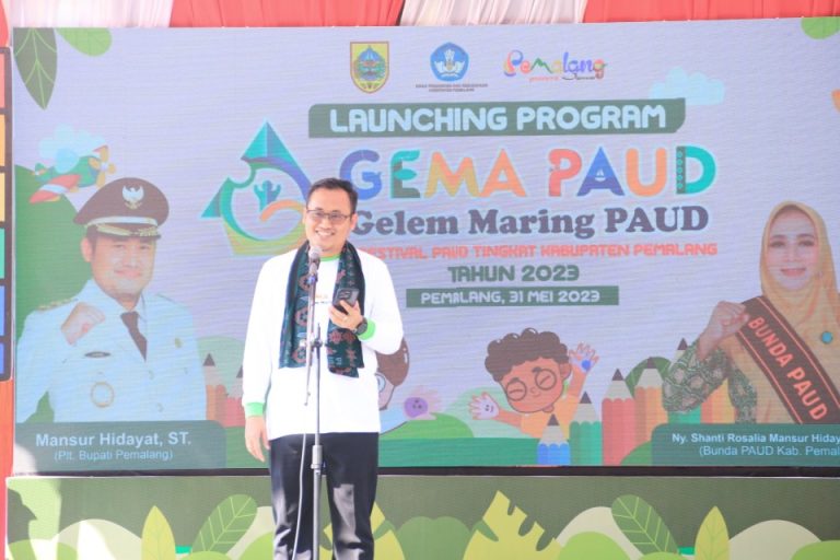 RILISJATENG.COM– Guna mencapai target partisipasi Pendidikan Anak Usia Dini (PAUD) nasional, Pemkab Pemalang mencanangkan program ‘Gelem Maring (Gema) PAUD’. Launching Gema PAUD dilakukan Plt Bupati Mansur Hidayat bersama Forkopimda dan Ketua TP PKK Kabupaten Pemalang, Shanti Rosalia di Sirkuit Pantai Widuri Pemalang, Rabu (31/5/2023) bersamaan dengan kegiatan Festival PAUD Tingkat Kabupaten Pemalang.