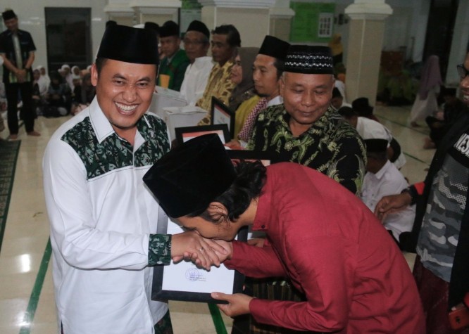 Selain tarawih dan silaturahim, Plt Bupati Pemalang bersama rombongan juga menyerahkan bantuan dari Kemenag, Baznas dan PMI kepada anak yatim dan kaum dhuafa serta takmir masjid.